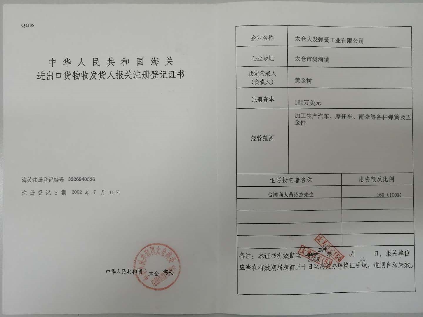 太倉大發彈簧工業有限公司由黃金樹先生于1967年始創于臺灣,是一個集雨傘、電子、五金機械、自行車、摩托車、汽車等的彈簧配件生產、加工、輔助設計服務的綜合性企業,其中1990年創辦的廈門大發彈簧公司、2000年創辦的深圳大發彈簧公司、2002年創辦的太倉大發彈簧公司均位于經濟發展地區,地理位置佳。我們憑借在彈簧制造業的多年豐富知識與技術,并著眼于以客戶為導向,秉持“以人為本,以質為先,以客為主,持續創新”的經營理念,強化競爭優勢。公司導入ISO9001: 2000質量管理體系,執行ISO14000:2000管理方式,倡導安全、高質量、高素質的生產。